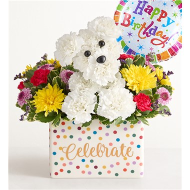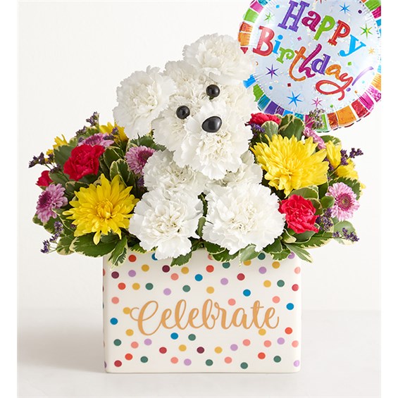 Now, this is a party animal! Our doggone adorable floral pup is hand-designed in a keepsake ceramic vase decorated with polka dots and “Celebrate” in gold script. Get ready to unleash the fun and create many long-lasting memories. • One-sided arrangement with white carnations, yellow cushion pom, lavender button pom, and hot-pink mini carnations, accented with assorted greenery • Handcrafted in the shape of a dog, complete with eyes and nose details • Artistically designed in a keepsake ceramic vase with “Celebrate” in gold script on the front and colorful polka dots on all four sides; measures 6.6”L x 3.4”W x 4.4”H • Arrangement measures approximately 12""H x 11""W • Our florists hand-design each arrangement, so colors and varieties may vary due to local availability Add to their gift: • 18"" helium-filled “Happy Birthday” Mylar balloon; design may vary due to local availability